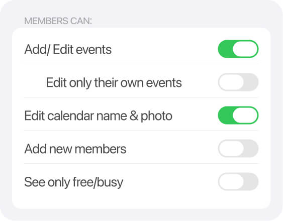 - Calendar member – Can view events of the calendar. Their permission to take specific actions is determined by admins based on the settings of the Members can section (see above for details).